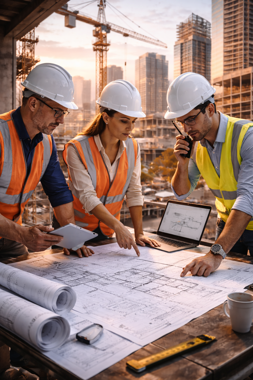 Actuamos como eje de coordinación de especialidades para proyectos inmobiliarios, integrando equipos de diseño arquitectónico, ingeniería, construcción, supervisión y proveedores técnicos.